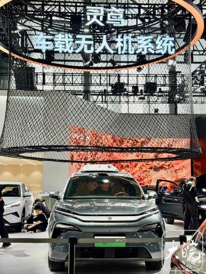记者注意到,比亚迪展厅展示了灵鸢车载无人机系统。现场工作人员告诉记者,该系统采用软硬一体的系统化设计,不仅继承了消费级飞机的高分辨率视频流和极致的避障算法,还通过车载定制实现随动跟拍、地空双摄、动态起降、收纳快充、一键大片等核心功能。
