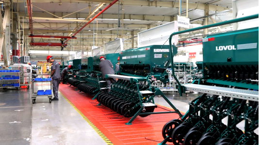 聚焦泥泞工况与三秋作业需求,四行、五行履带式玉米机,四驱玉米机型、大马力拖拉机,播种机、烘干机等成为生产主线,履带机玉米割台等重点部件加紧生产,为“三秋”一线输送最应时的农机装备。