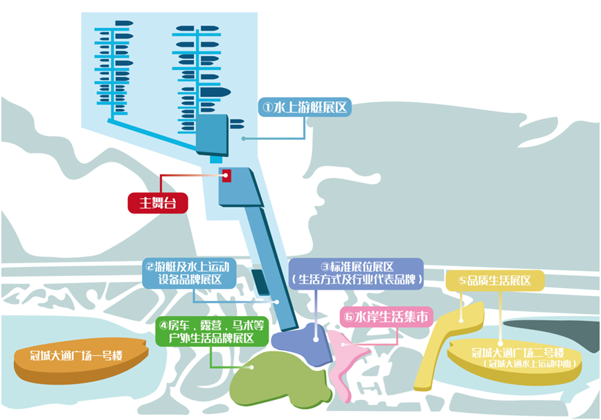 户外展区部分办展地点位于冠城大通广场&冠城大通游艇码头,展区面积2万平方米。