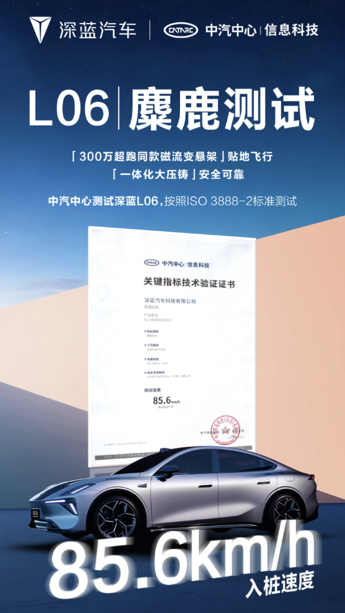 近日,深蓝汽车公布了深蓝L06的麋鹿测试成绩,入桩速度达到85.6km/h,展现出卓越的操控稳定性。官方解读称,这一优异表现的核心支撑是车辆搭载的“300万级超跑同款磁流变悬架”,该配置为深蓝L06赋予了“贴地飞行”般的驾驶质感。