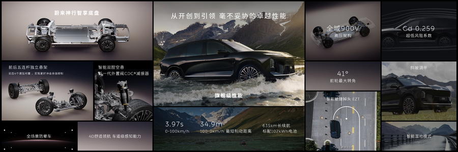全新ES8搭载蔚来最新一代全域900V高压架构,标配102kWh电池,配合520kW前后双电机,峰值扭矩700N·m,零百加速时间仅需3.97秒。全车122处空气动力学优化,风阻系数低至0.259,CLTC综合续航里程达到635公里。