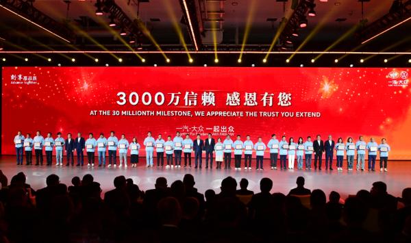 仪式现场,为一汽-大众历任总经理及第一财务副总经理代表、中外方模范员工代表颁发“3000万荣誉 薪火同耀”专属纪念奖杯,为30位一汽-大众客户代表颁发“3000万辆客户勋章”,为忠实品牌老友送上惊喜大礼。