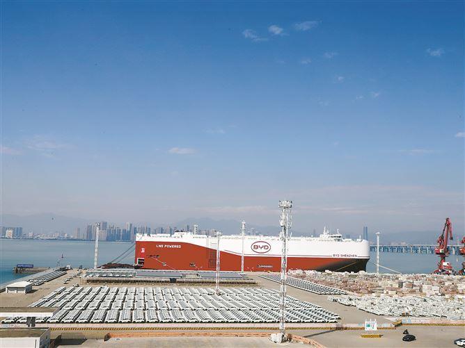 昨日,1768辆比亚迪新能源汽车准备上船出发。(余明霞 摄)