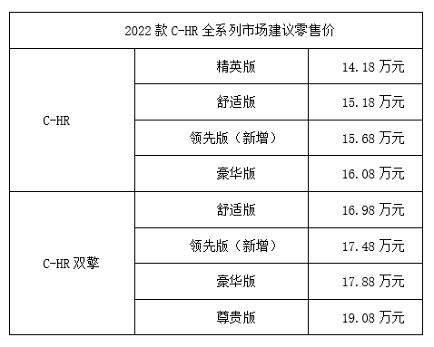 2022款C-HR全系列官方指导售价14.18-19.08万元。