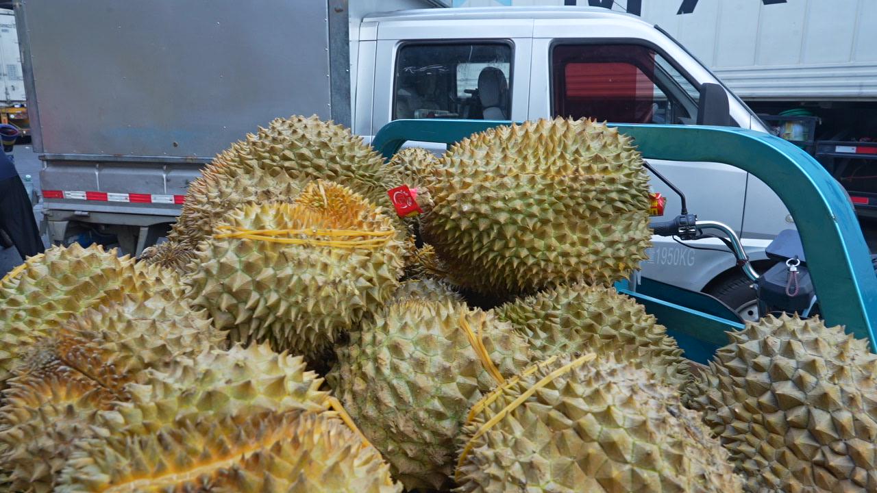 嘉兴海广兴水果市场上预备运往档口销售的榴莲