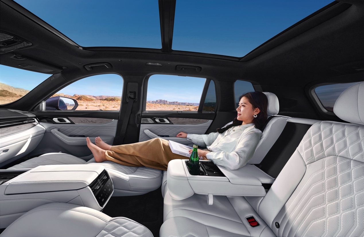 宽绰空间是基础,奢适配置更是一步到顶。二排新增多功能中央扶手,放倒秒变商务四座行政座舱;二排小桌板,既是长途自驾的阅读桌和移动餐吧,又是商务出行的移动工作台。全车Nappa真皮覆盖,三档加热、通风和8点式背部按摩由前排独享进阶为四座同享,带来二排舒压放松的平权,搭配双层静音隐私玻璃和遮阳帘,能有效防晒、保护隐私;车内还配备14扬声器Bose定制音响、海洋之谜香氛系统以及四温区空调等诸多高端配置,私享尊贵感拉满,所见、所触、所听、所享在30万内一步到顶,尽显豪华。同时,副驾还新增280mm一体式4向电动腿托,可一键开启女王专享,舒适躺姿堪比航司头等舱。