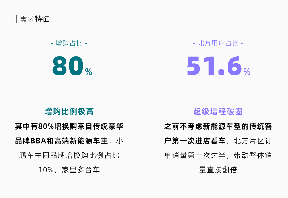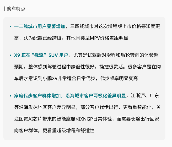 正是这些根本性的产品革新,让小鹏X9超级增程的用户画像呈现出前所未有的“年轻化、破圈层”特征:90后占比高达57.2%,00后占比13.7%(远超行业2%的平均水平),整体用户年龄比MPV平均年轻10岁;女性车主占22%;个人用户交付占比近八成,领先同级约35个百分点;在北方严寒地区增速显著,并成功打入香港、印尼等市场。 这些数据生动地描绘出一幅图景:MPV不再是商务或“老龄家庭”的专属,它正成为注重家庭品质也坚持自我风格的年轻中产、科技爱好者、时尚先锋家庭的首选主力座驾。