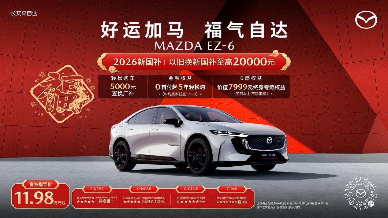 从2025的逆势跃升,到2026的全球启航;从EZ-60运动版的锋芒登场,到全系智慧升级与新春福利矩阵齐发,长安马自达正以设计、安全、驾趣的全域进化,回应时代的叩问,也回应每一份对出行的热爱。这不仅是产品的迭代,更是品牌与用户之间,一场关于信任与共鸣的双向奔赴。