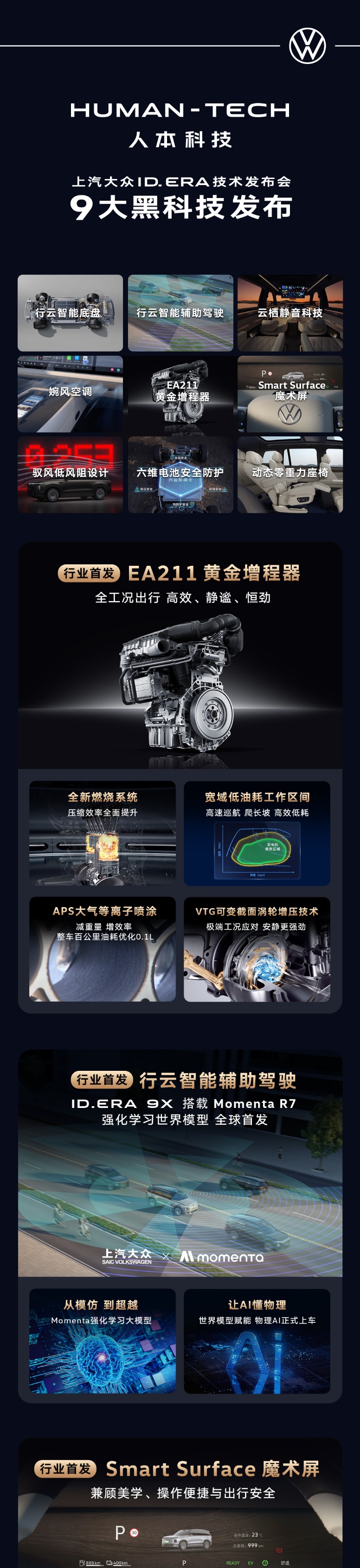 近日,上汽大众发布了ID. ERA系列的核心技术矩阵——黄金增程、行云智能底盘、云栖智舱、行云智能辅助驾驶首次完整解码,并揭秘了行业领先的9大黑科技,此举标志着上汽大众“全球智慧”与“中国速度”深度融合的战略布局进入实质性落地阶段,为中国市场带来了真正“懂中国路、懂中国人”的新能源车型。