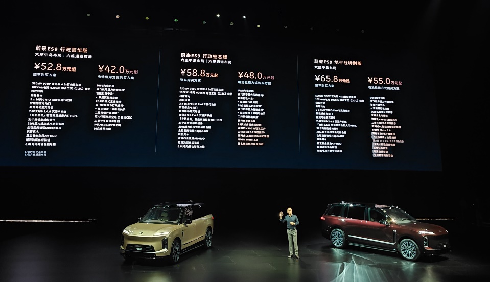 4月9日,蔚来11年体系创新的集大成之作——蔚来ES9在杭州发布并开启预售。ES9行政豪华版预售价52.8万元起,行政签名版预售价58.8万元起,地平线特别版预售价65.8万元起,但凡采用BaaS电池租用方式购买,上述车型的预售价自动减去10.8万元。预定权益为5000元预订金可抵10000元购车款,老用户复购可享6000元-8000元的专属焕新礼金券等福利。