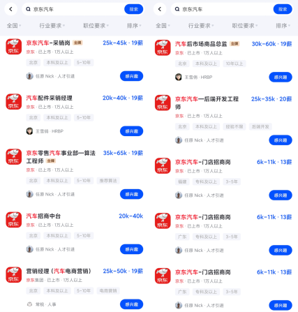 在新车信息密集曝光的同时,记者注意到,京东汽车近期在人才招募上也有大动作。多个招聘平台信息显示,京东汽车已释放多个高薪岗位,部分岗位年薪突破百万元:汽车零售事业部算法工程师岗位年薪最高可达123万元(35k-65k·19薪),汽车后市场商品总监岗位年薪最高可达114万(30k-60k·19薪),汽车行业采销负责人年薪最高可达112万(45k-70k·16薪),整车营销专家与用户研究专家年薪最高可达133万(40k-70k·19薪),商家生态负责人年薪最高也可突破百万(60k-90k)。知情人士分析,此举或为“国民好车”上市及后续用户运营、供应链管理储备核心力量。