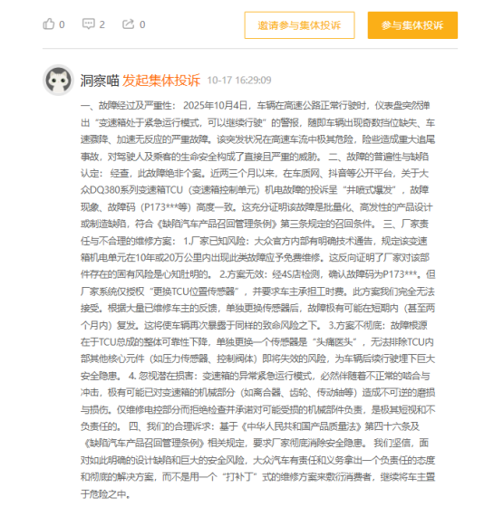 田先生回忆,车辆在质保期内曾因变速箱漏油更换“机电一体化部件盖罩”,当时 4S 店未提示潜在风险,如今回看这正是后续故障的前兆。而故障集中爆发时,多数车辆已过质保期,车主面临两难抉择:更换机电总成需花费上万元,而车辆残值仅数万元;接受 4S 店 “仅换传感器” 的方案,又担心无法根治隐患。