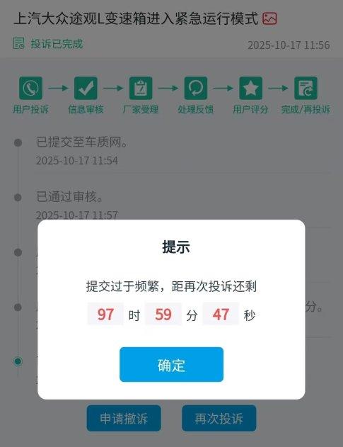 记者在黑猫投诉、车质网等多个互联网投诉平台发现,截至2025年10月,针对上汽大众2017至 2020款途观 L、途岳、途昂等车型投诉量已达数千起,且投诉中反映的共性故障现象高度一致——仪表盘均会反馈 “变速箱处于紧急运行模式,可继续行驶”。目前,该问题已引发消费者集体投诉,成为舆论关注的焦点。