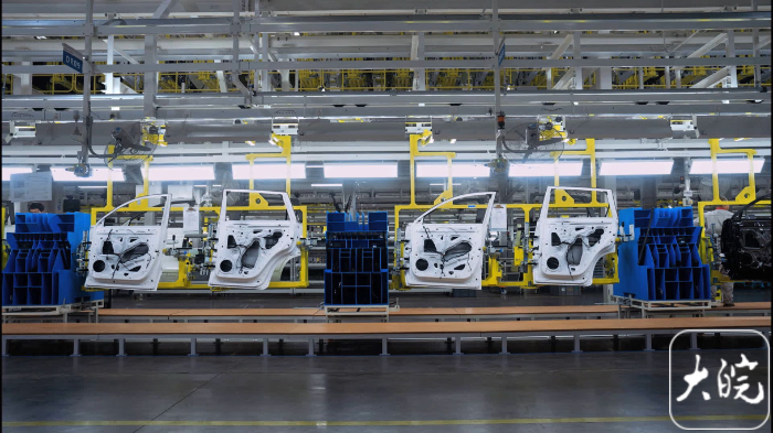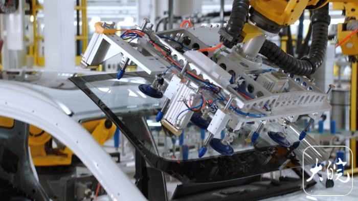 在总装车间,共有6条自动化主线、5条柔性分装线、3条高精度检测线,可满足3平台8车型的混线生产,实现燃油车、混动车型、纯电车型的混线生产。总装车间整体自动化率20%,处于行业领先水平(行业最高不超过20%)。大件自动化率100%,包括前后风挡玻璃、天幕全景天窗、无边框四门调整、轮胎等大型零部件,都由智能装配工作站自动化作业。