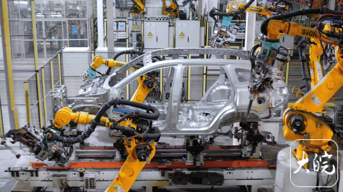 11月13日,采访团走进位于芜湖市的奇瑞智造一工厂。生产车间内,一台台机械臂有节奏地挥舞,现场焊花四溅。
