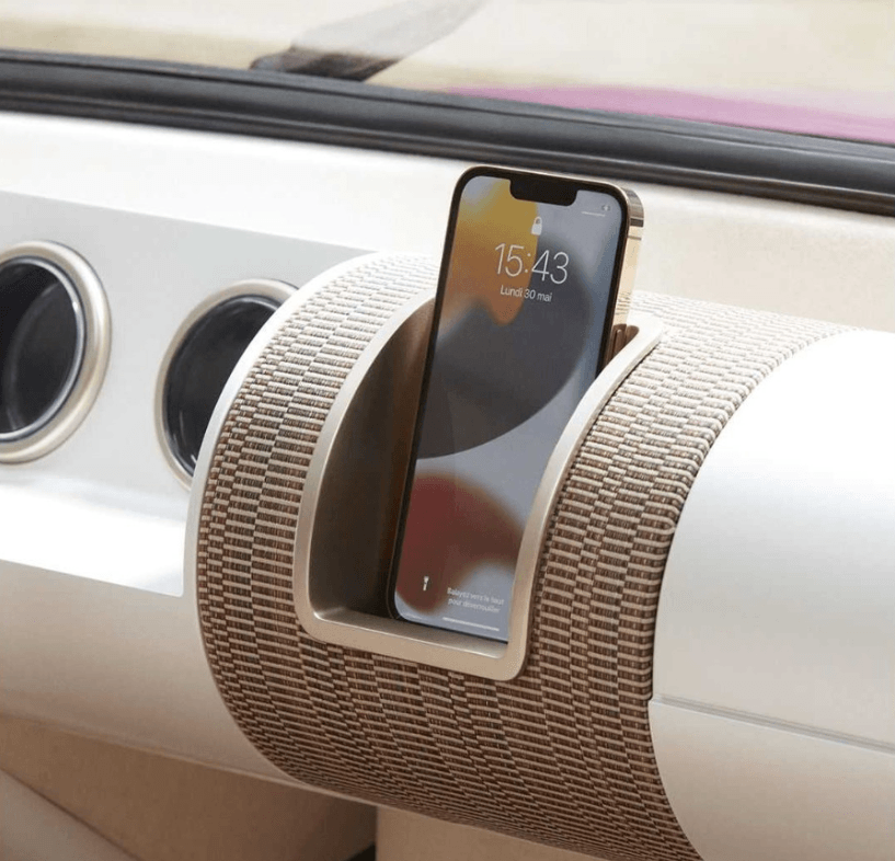 内饰设计风格主要以复古为主,让我们比较惊奇的是,雷诺 5钻石版概念车没有配备液晶大屏,所有导航和娱乐信息需要通过手机来实现,所以贴心的为智能手机安置了卡槽。此外,新车还具备指纹解锁功能,这一功能使用起来比较方便。