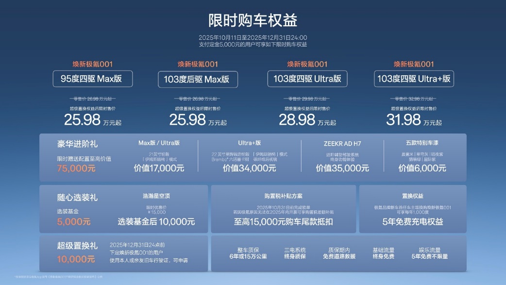 10月11日,豪华猎装轿跑焕新极氪001正式上市,官方零售价26.98万元起,超级置换权益后,限时售价为25.98万元起。即日起,用户可通过极氪App、官网、小程序及全国极氪门店等官方渠道预订。