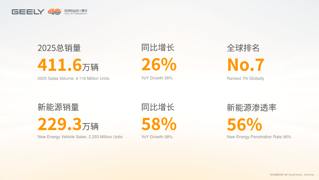 2025年,吉利控股集团交出了一份沉甸甸的答卷:销量突破400万辆大关,定格于411.6万辆,同比增长26%,连续五年奏响增长的凯歌。更为闪耀的,是其中229.3万辆新能源汽车的销量,如星辰般点亮了56%的渗透率天空。数字背后,是一个横跨大地、低空乃至卫星轨道,由数据与电能编织的宏大立体出行生态。