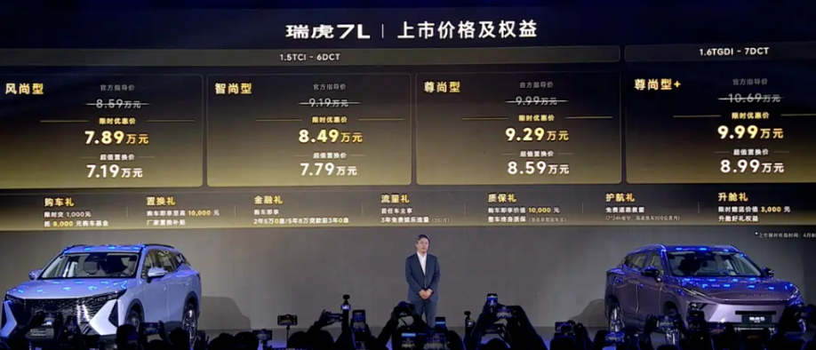 4月8日,奇瑞瑞虎家族迎来“大动作”。瑞虎7L、新款瑞虎7、瑞虎5运动版三车一起上市,为年轻家庭带来10万元内家用SUV的超值选择。其中,瑞虎7L限时优惠价7.89万-9.99万元;新款瑞虎7限时优惠价6.99万-8.19万元;瑞虎5运动版限时优惠价7.09万-8.09万元。